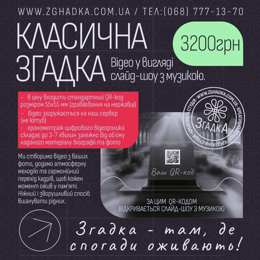 Ми створимо відео з ваших фото, додамо атмосферну мелодію та гармонійний перехід кадрів, щоб кожен момент ожив у пам’яті. Ніжний і зворушливий спосіб вшанувати рідних. В ціну входить стандартний QR-код розміром 55x55 мм (гравіювання на нержавці). Надійне збереження інформації, доступне лише вам та обраним особам в кого є доступ до QR-коду. Миттєвий доступ до відео з будь-якого пристрою.
