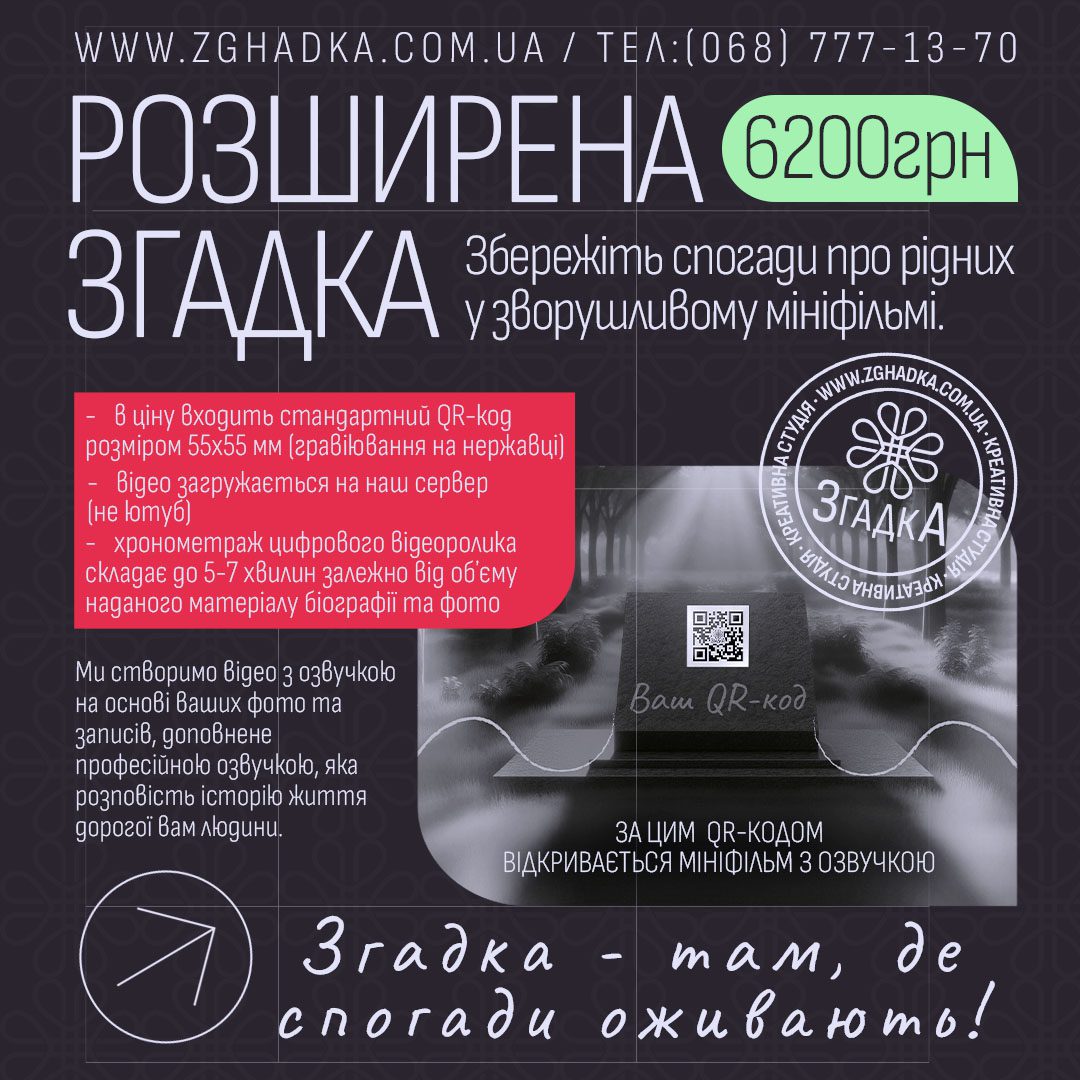 Ми створимо відео з озвучкою на основі ваших фото та записів, доповнене професійною озвучкою, яка розповість історію життя дорогої вам людини. В ціну входить стандартний QR-код розміром 55x55 мм (гравіювання на нержавці). Надійне збереження інформації, доступне лише вам та обраним особам в кого є доступ до QR-коду. Миттєвий доступ до сторінки з будь-якого пристрою.